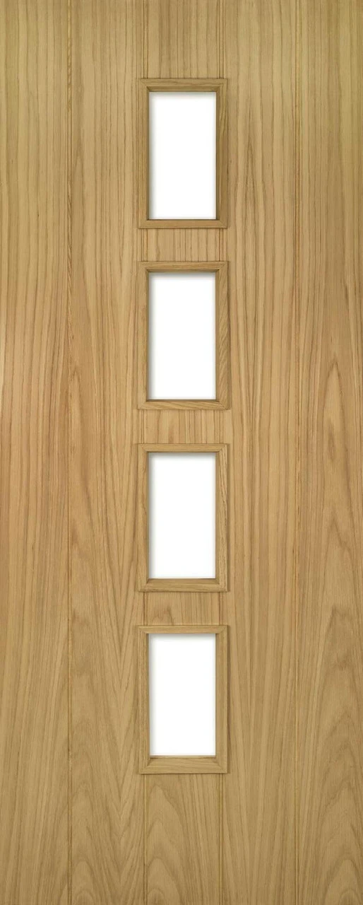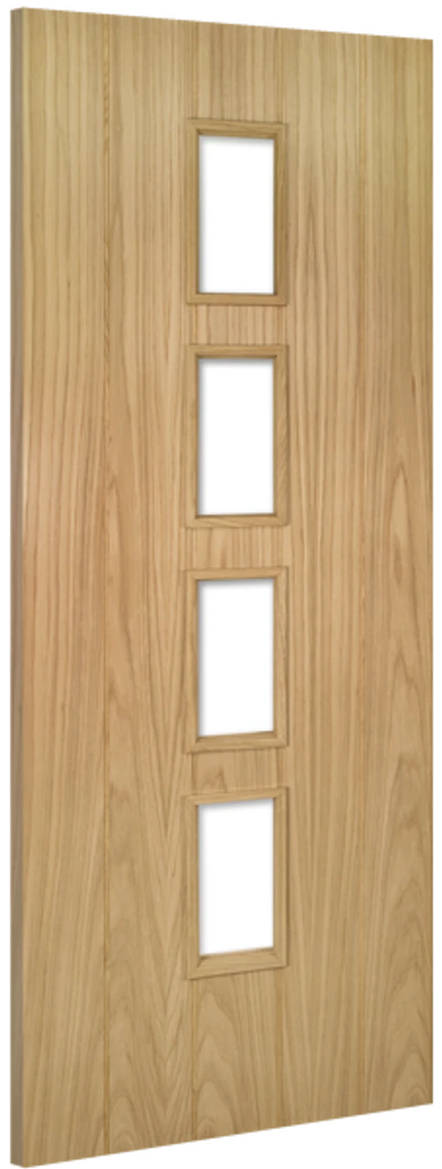 With beautiful crown-cut oak veneer overlaying a solid core, the Galway Oak door is the perfect combination of strength and good looks. The solid door consists simply of five bevel-cut vertical panels that showcase the glorious oak veneer grain. Use hardwax oil on this unfinished oak door to emphasise the grain and promote its natural characteristics. The glazed door features four panes of clear, toughened glass set into the central panel. Both versions of the Galway Oak door are available as fire doors.