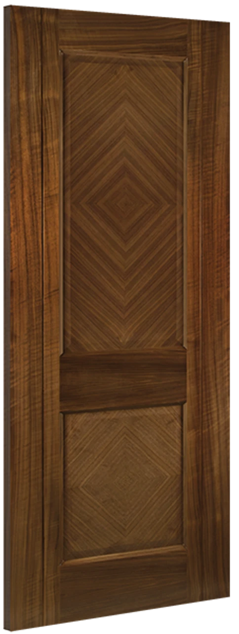 This elegant door is beautifully finished and ready for installation anywhere in the home. In the solid version, a rectangular panel of walnut veneer occupies the upper two-thirds of the door, whilst in the glazed door, this section is fitted with six rectangular panes of clear, bevelled-edged glass. Sporting classic diamond match veneers, the Kensington Walnut door adds impact and sublte sophistication to any room.