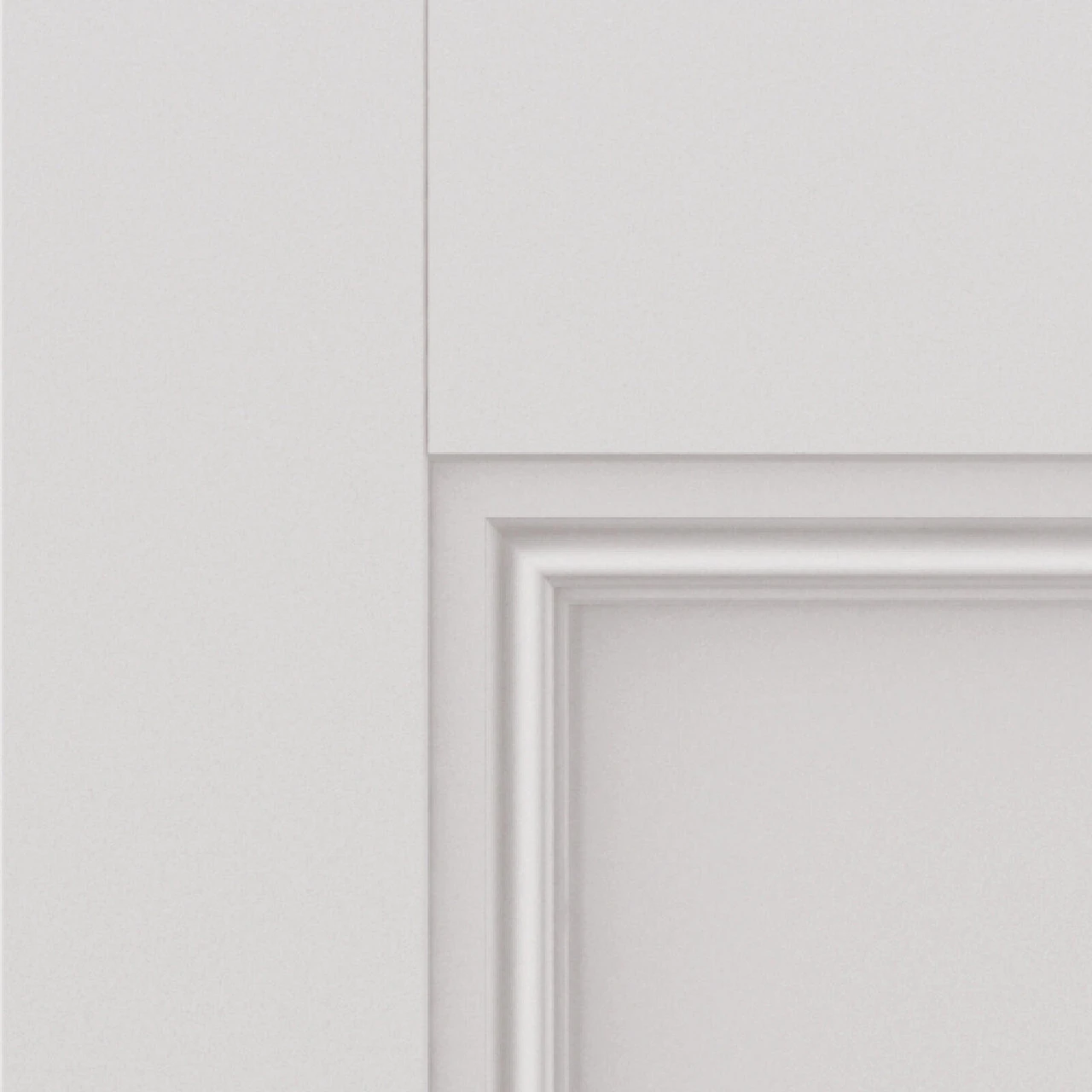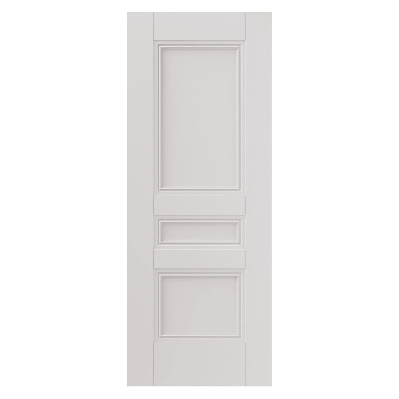 Classic white primed interior door with 3 recessed panels and decorative flush mouldings