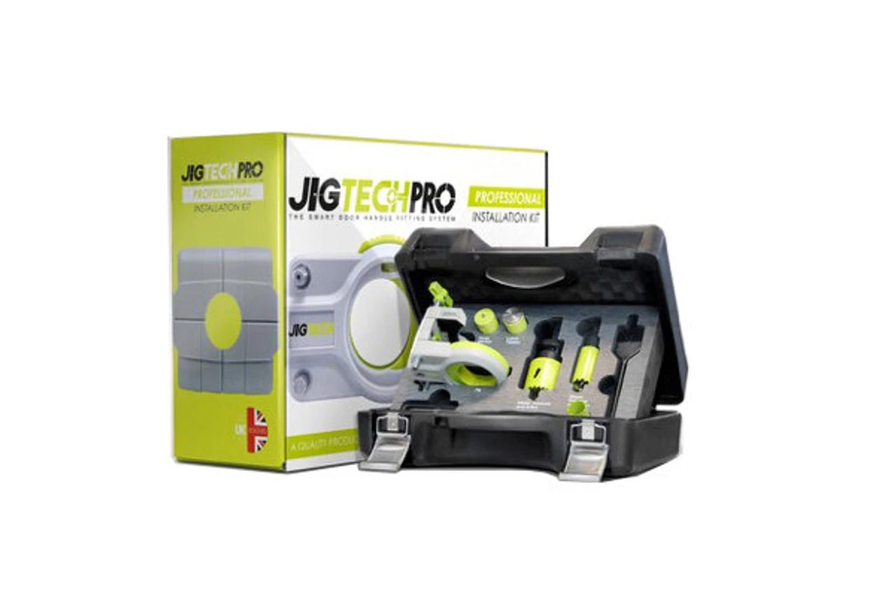 The Jigtech Pro Installation Kit is the innovative method of quickly installing door furniture. This handy door fitting system is ideal for both the professional joiner and the homeowner as installation times are reduced by up to 80%. The tool completely removes the need to take accurate measurements and mark out to install your door handles, latch and keep. The tool shows you where to drill, whilst the rest of the equipment in this Kit will help you with everything else.