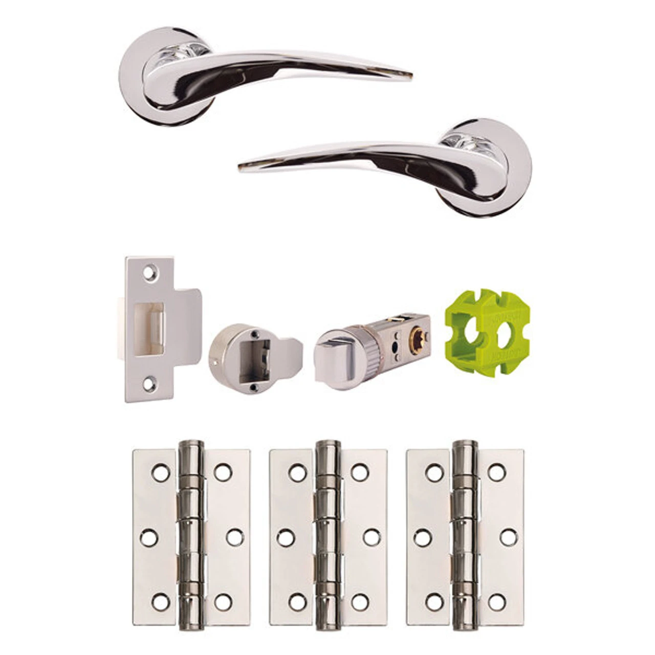The Jigtech Vecta Door Pack on Round Rose has a polished chrome finish and includes markings on the spindle that are door width to make life easier for you. The door handle is designed to be installed using the innovative Jigtech system that removes the need to measure and mark out where the handle, latch and keep need to go, speeding up the process of installing your door.