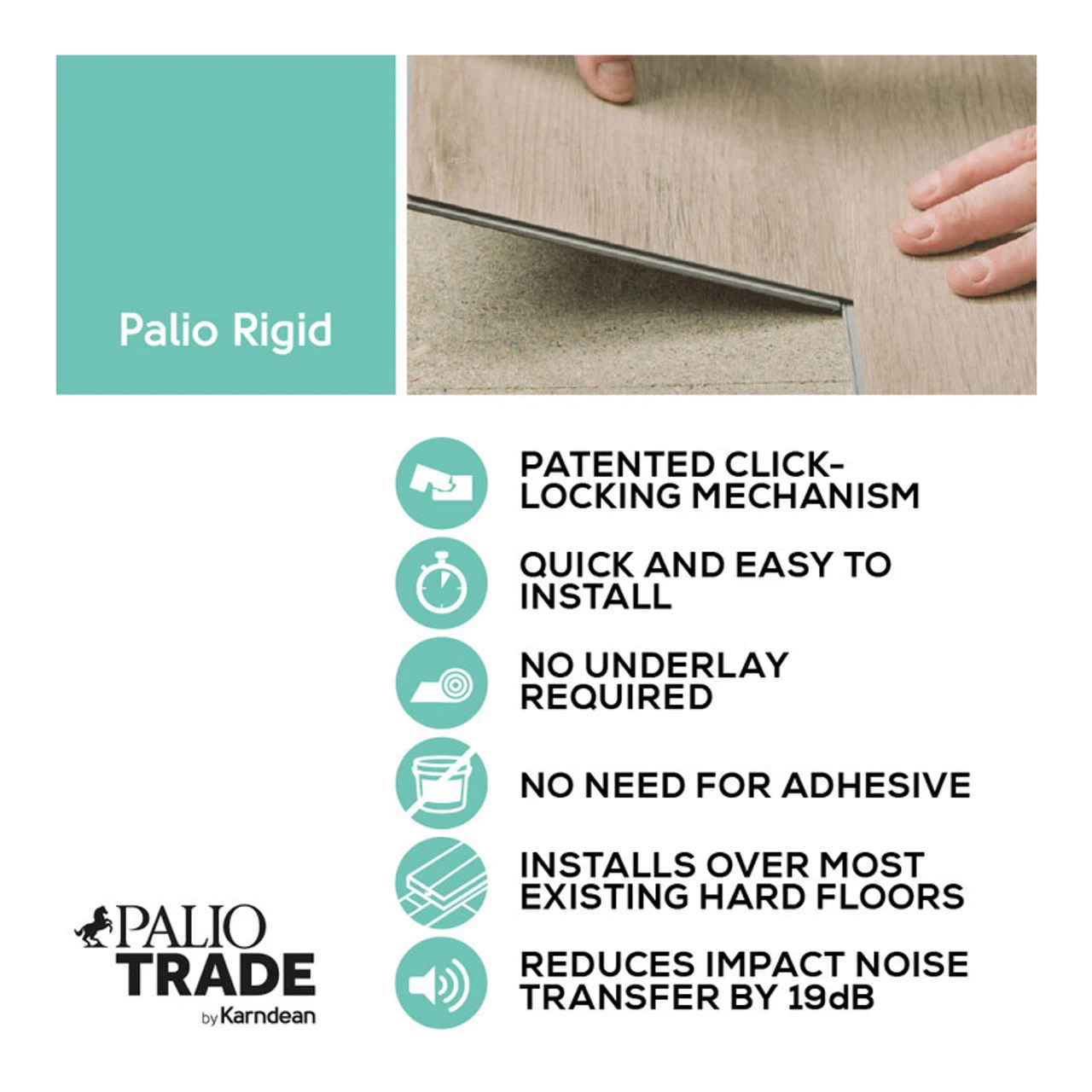 Vivara is rich in dark-brown tones and offers a realistic combination of knots and grains, providing an opulent finish ideal for any environment. The stiff core architecture of Palio Rigid, combined with a 2GTM click-locking mechanism, increases resilience on uneven subfloors. It does not require extra underlay and may cut down noise transfer to rooms below by 19dB thanks to its acoustic foam backing.