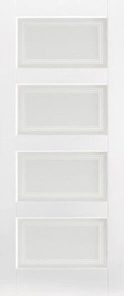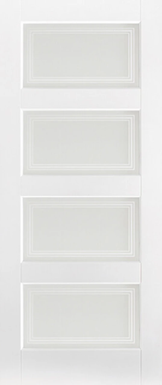 This contemporary door features four rectangular frosted glazed panels with clear lines and a primed solid core in a versatile white shade.
