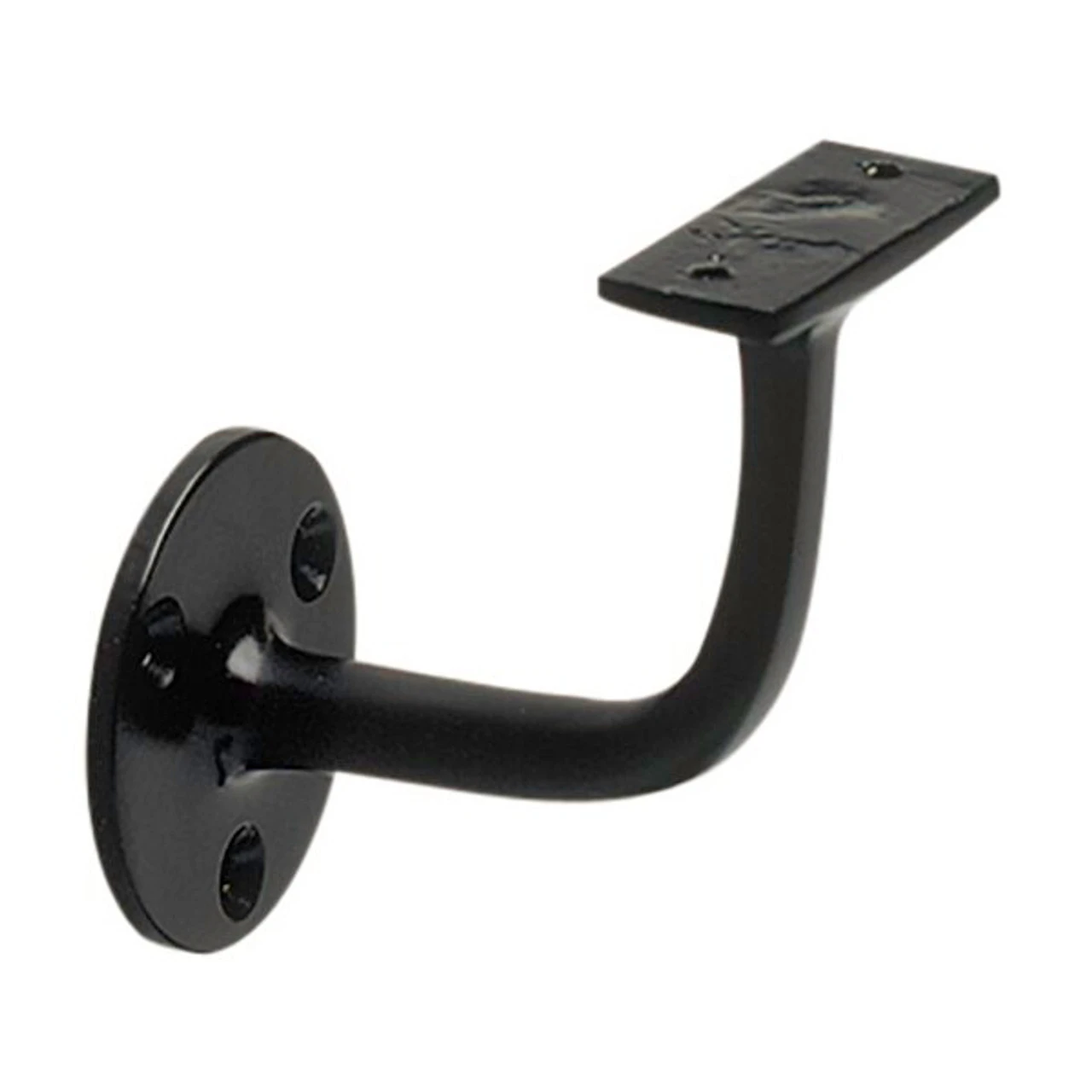 Standard black wall bracket by Richard Burbidge Trademark. Fits circular railings with a 54mm diameter. On a PCD (pitch circle diameter) of 37mm, the wall plate contains three countersunk 4.5mm diameter fixing holes. The handrail attachment is 20mm broad by 50mm long, with two countersunk mounting holes.