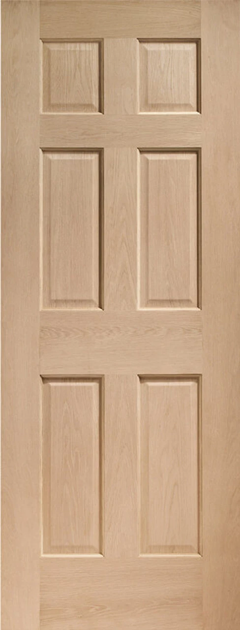 A classic 6 panel unfinished oak door. A popular and elegantly traditional door the Colonial offers a stunning option that will add a classic look to any home. Raised and fielded panels which create a bevelled edge effect around the panels offering greater depth to the door and add a real sense of style. This door does not offer a raised mouldings around the outside of the panels which means that whilst it is a traditional style door it will not look out of place amongst modern fittings. A matching fire door option completes this range.