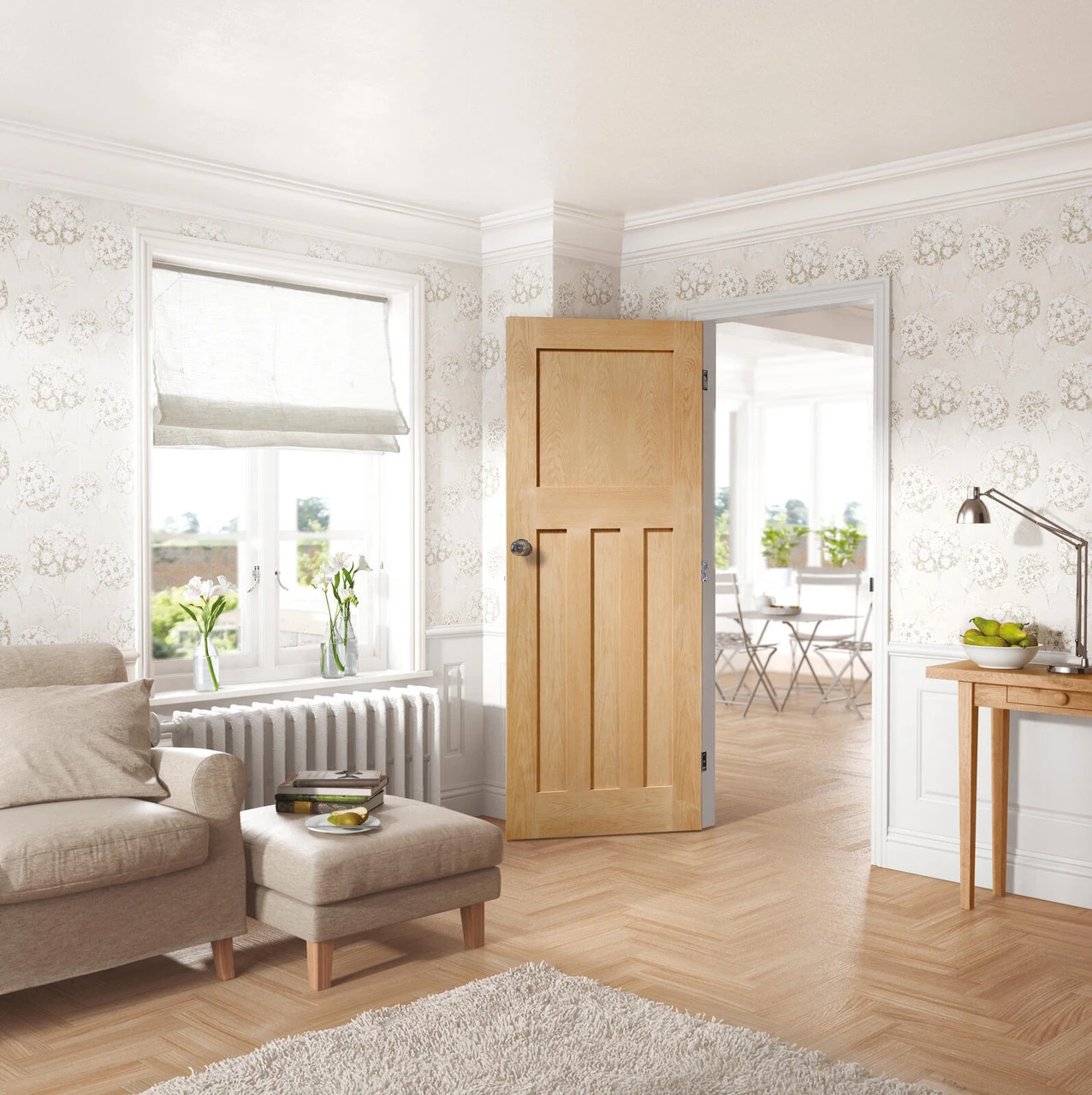 A 1930s inspired unfinished oak door with flat recessed panels. The flat recessed panels in the 1930s inspired DX door helps create a popular and impressive design that can really add value to a property. Matching glazed and fire doors makes up this stylish range.