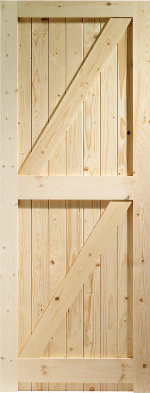 A traditional style ledged and braced external pine gate A sturdy external framed ledged and braced pine door, ideal for a external gate or shed door. This door is manufactured using a tongue & grooved technique of interlocking each boarded panel with a ridge on one side. The FLB external pine door is supplied with loose pinned braces to allow for them to be altered depening on the need. This boarded braces fixed with screws & staples. Hinges should alwasys be fitted where the braces point down (left hand side on the image).