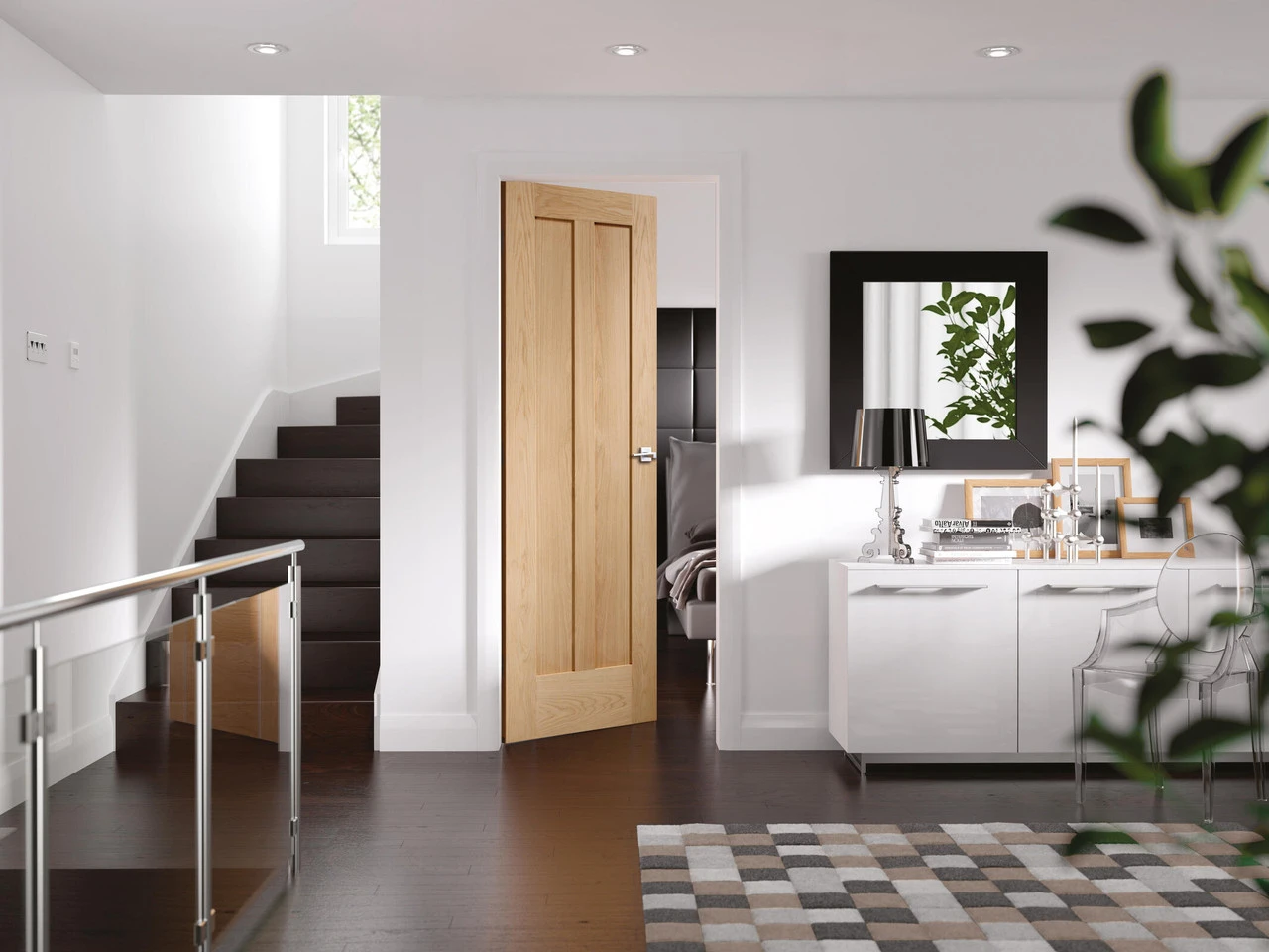 A half-hour rated flat panelled Oak door from the Metropolitan Collection. Supplied unfinished ready to pain or stain. Supporting panelled and glazed doors complete this modern style of door.