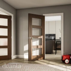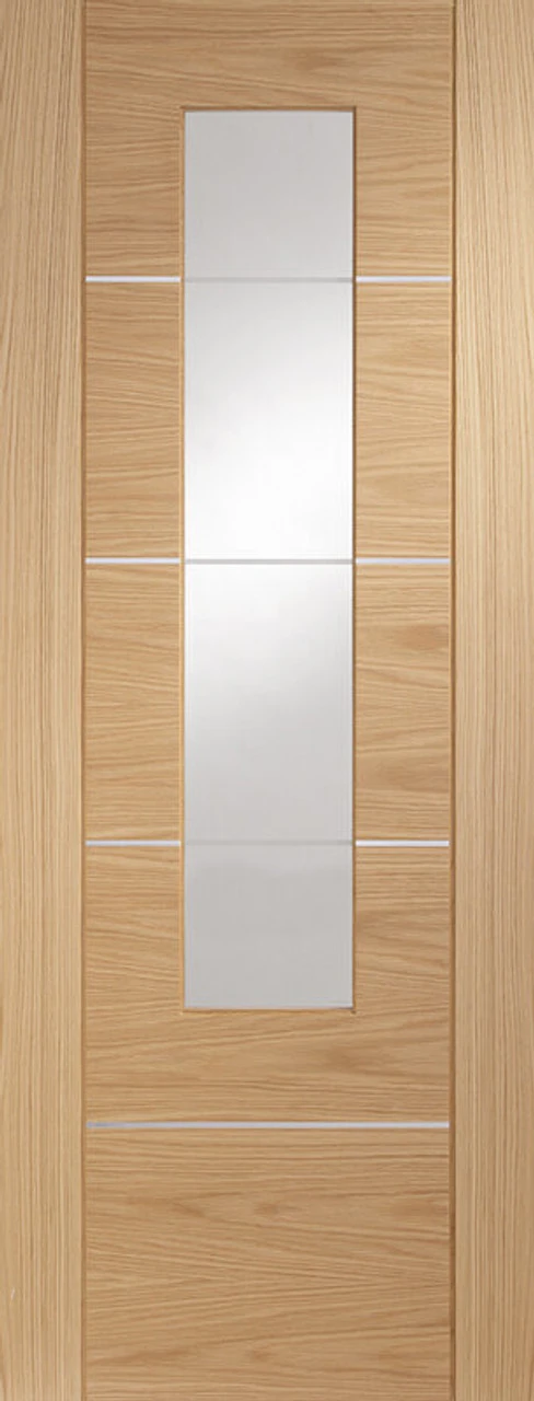A contemporary fully finished Oak door with horizontal panels and real aluminium inlays. The fully finished Oak Portici fuses striking horizontal grain with real aluminium inlays to create an impressive looking door that would bring a touch of class to any home. A clear glazed panel in the centre of the door allows for light to be transferred from one room to another and the intricate etching gives this door a real sense of style. Fully Finished in a clear AC lacquer and ready to hang. Corresponding panelled and fire doors are also available in the range along with a Walnut alternative.